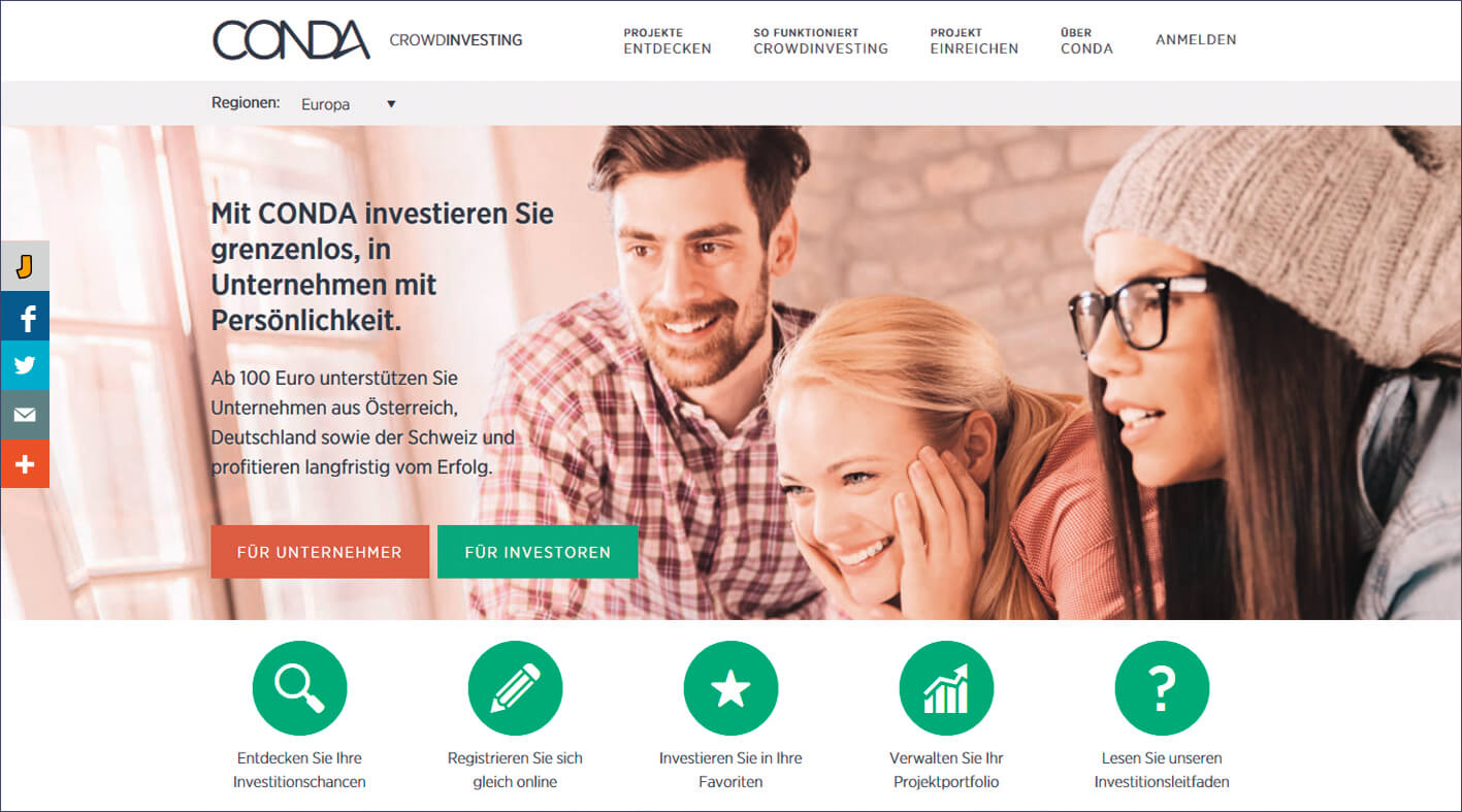 CONDA ist ein österreichisches FinTech Start-up und bietet eine Plattform, die sich auf Crowdinvesting für Startups, KMUs und Immobilienprojekte spezialisiert hat. Dabei arbeiten wir mit qualifiziert nachrangigen Darlehen in unterschiedlichen Ausprägungen, je nach Art des Projekts. Wir unterstützen die Teams in der Planung ihrer Kampagnen und helfen bei einem professionellen Auftritt an der Öffentlichkeit, damit jeder das meiste aus seiner Crowdinvesting-Kampagne machen kann!